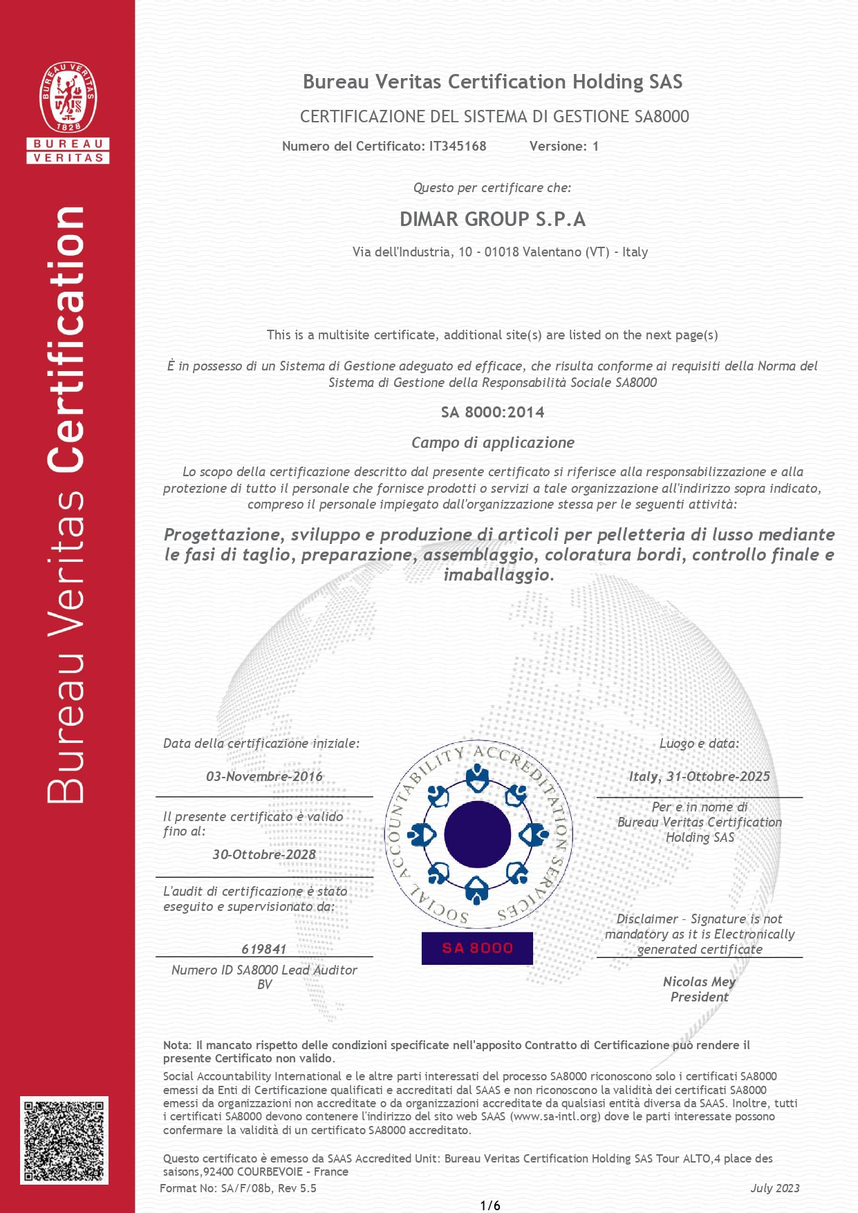 Sin dalla sua nascita, Dimar Group ha avviato il percorso per la progettazione e l’implementazione di un sistema di gestione per la responsabilità sociale in accordo alla norma internazionale SA8000, ottenendo la certificazione da parte del Bureau Veritas Italia Spa nel mese di novembre 2016. Nel 2019, inoltre, la certificazione è stata estesa a tutti gli stabilimenti aziendali.